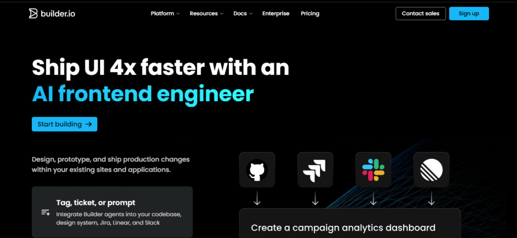 Builder.io still plays an important role for visual design, but it does not provide the same depth of AI-driven workflow automation.