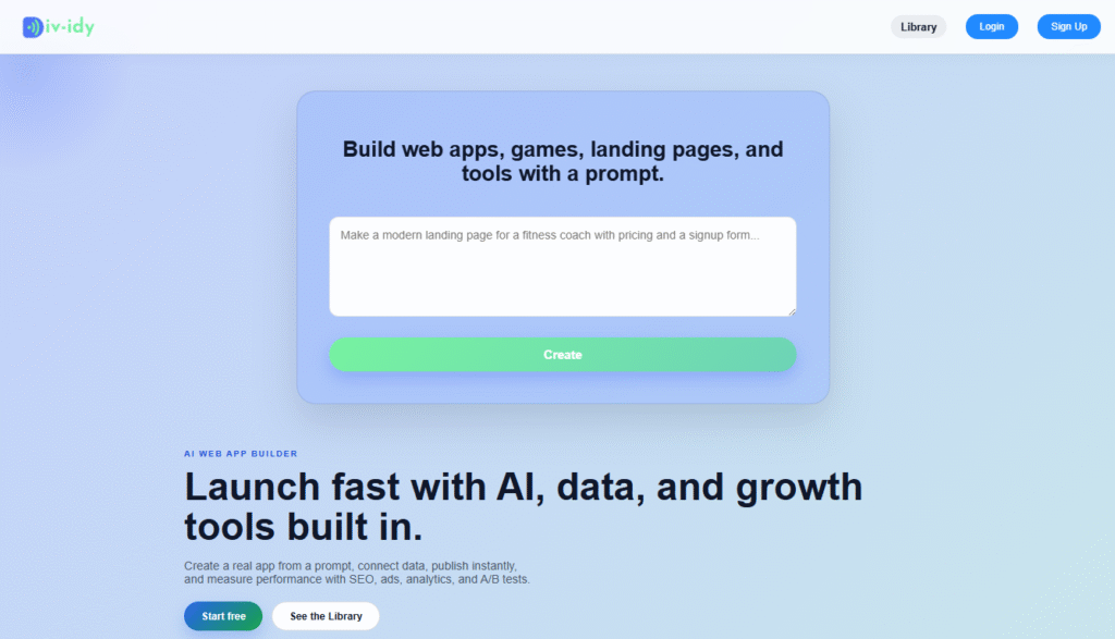 Div-idy is a no-code AI platform that focuses on simplified app or interface building. It is designed for users who want to generate layouts and functional designs quickly without deep technical knowledge. The platform emphasizes speed, ease of use, and accessible AI-assisted creation.